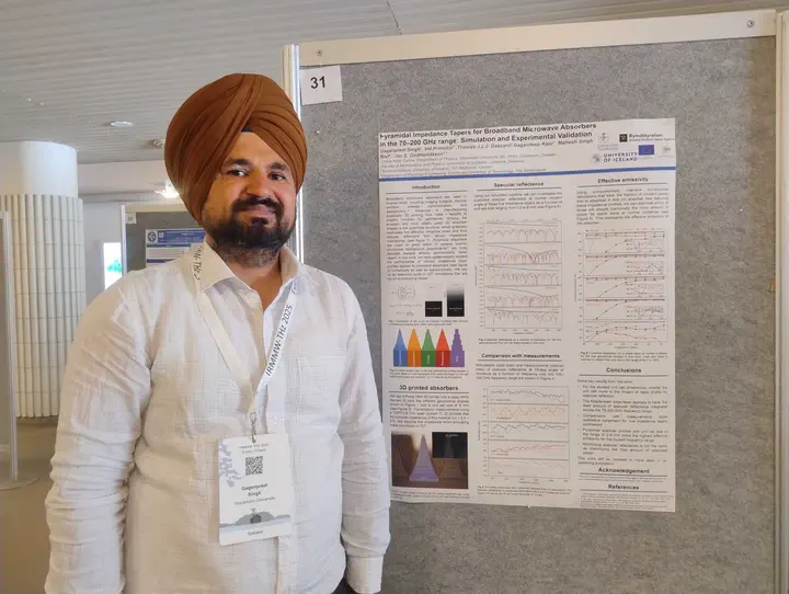 Gaganpreet Singh presented his work on absorber development at the IRMMW-THz conference at Aalto University. Here is a photo of Gaganpreet standing next his poster. The conference organizers told everyone to prepare posters in A1 format and then provided stands in A0 format…